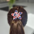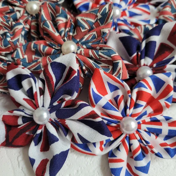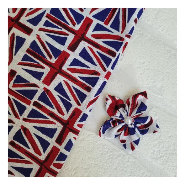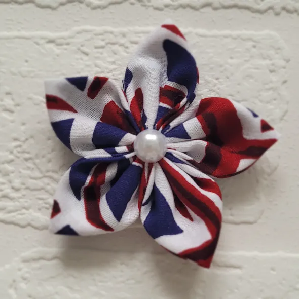 This handmade, union jack star flower is made brooch to wear on your jacket or top! It can also be made as a hair clip or bobble.